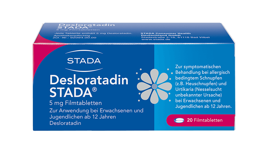 Desloratadin STADA® bessert die Symptome bei allergischer Rhinitis (durch eine Allergie hervorgerufene Entzündung der Nasengänge, beispielsweise Heuschnupfen oder Hausstaubmilben-Allergie). Diese Symptome beinhalten Niesen, laufende oder juckende Nase, Juckreiz am Gaumen und juckende, gerötete oder tränende Augen. Es wird ebenfalls angewendet zur Besserung der Symptome bei Urtikaria (ein durch eine Allergiehervorgerufener Hautzustand). Diese Symptome beinhalten Juckreiz und Quaddeln. Die Besserung dieser Symptome hält einen ganzen Tag an und hilft Ihnen, Ihre normalen Alltagsaktivitäten wieder aufzunehmen und Ihren Schlaf wiederzufinden. Wenn Sie sich nach 10 Tagen nicht besser oder gar schlechter fühlen, wenden Sie sich an Ihren Arzt.